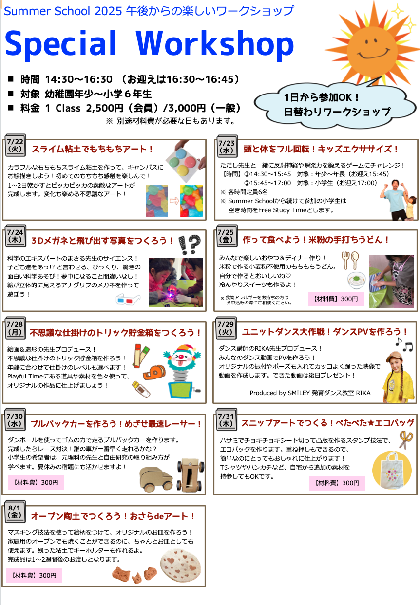 朝からは、英語で活動する「Summer School」そして、14:30〜16:30のSpecial Workshopでは、日替わりの楽しいプログラムをご用意しています。