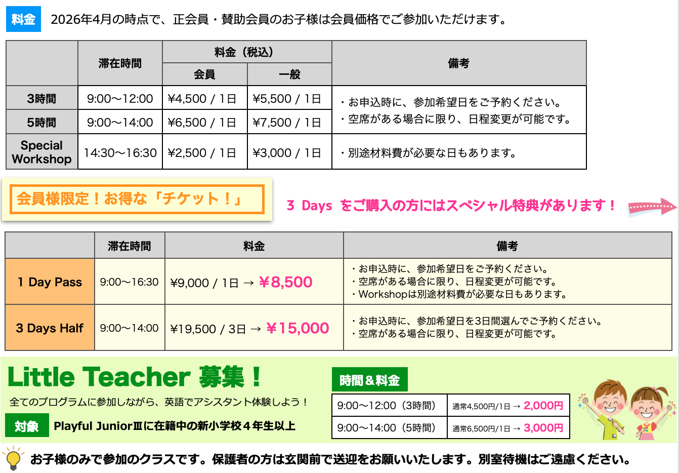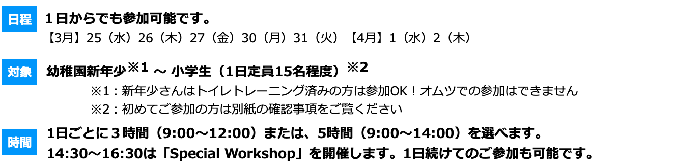 さらに、午後からのSpecial Workshopにも参加すると、最長で9:00〜16:30まで滞在できます。