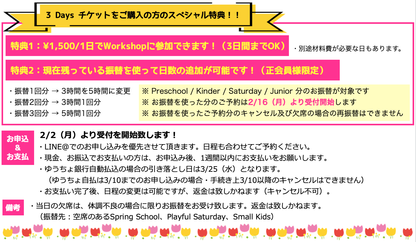 堺市堺区の子ども体験スクールPlayful Timeでは、春休み限定の特別プログラム「Spring School」「Spring Workshop」を開催しています。