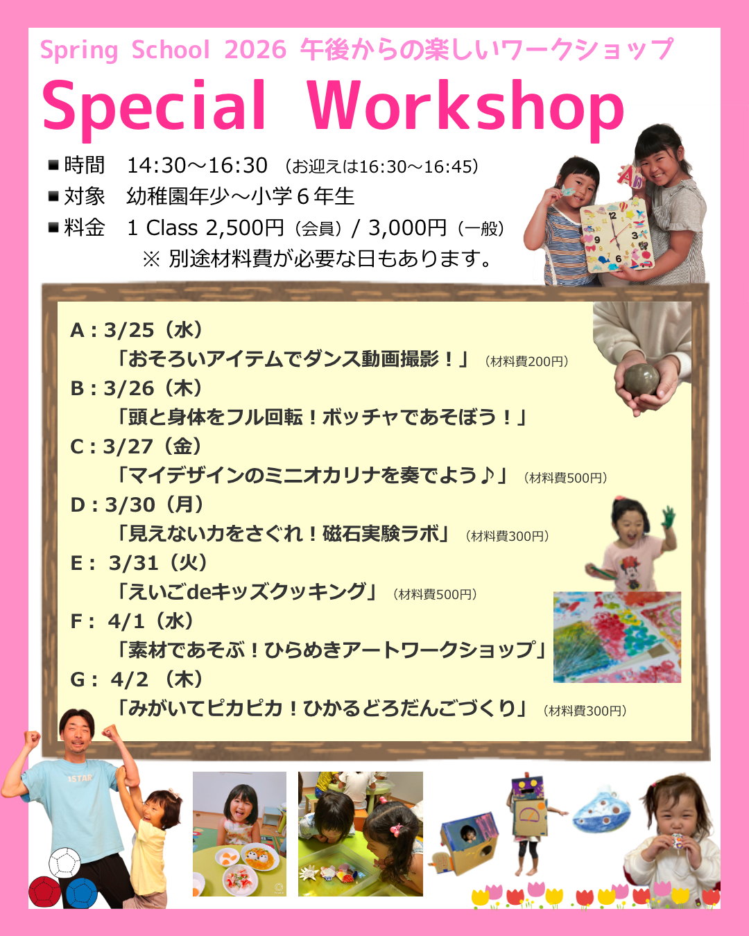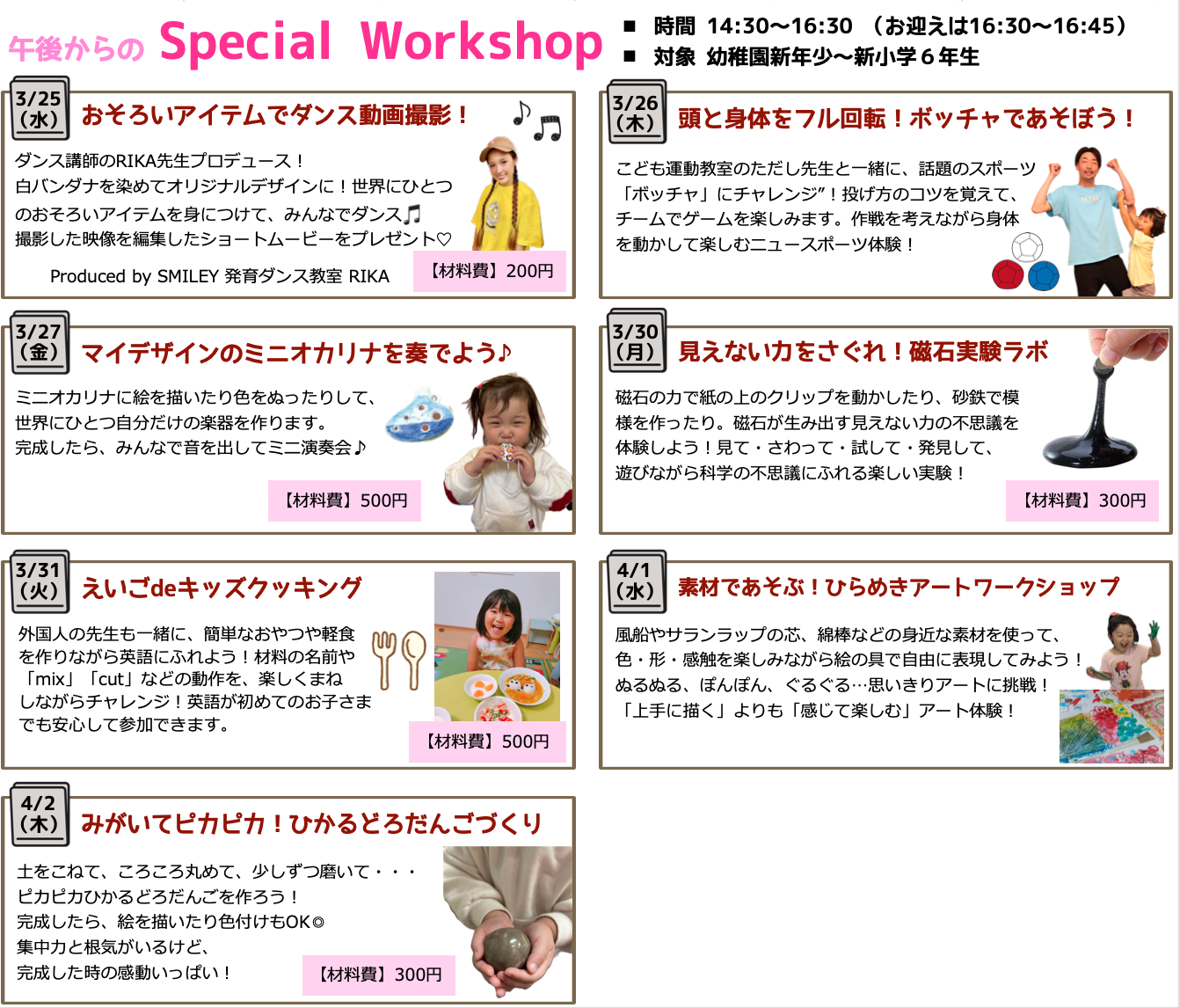 朝からは、英語で活動する「Spring School」そして、14:30〜16:30のSpecial Workshopでは、日替わりの楽しいプログラムをご用意しています。