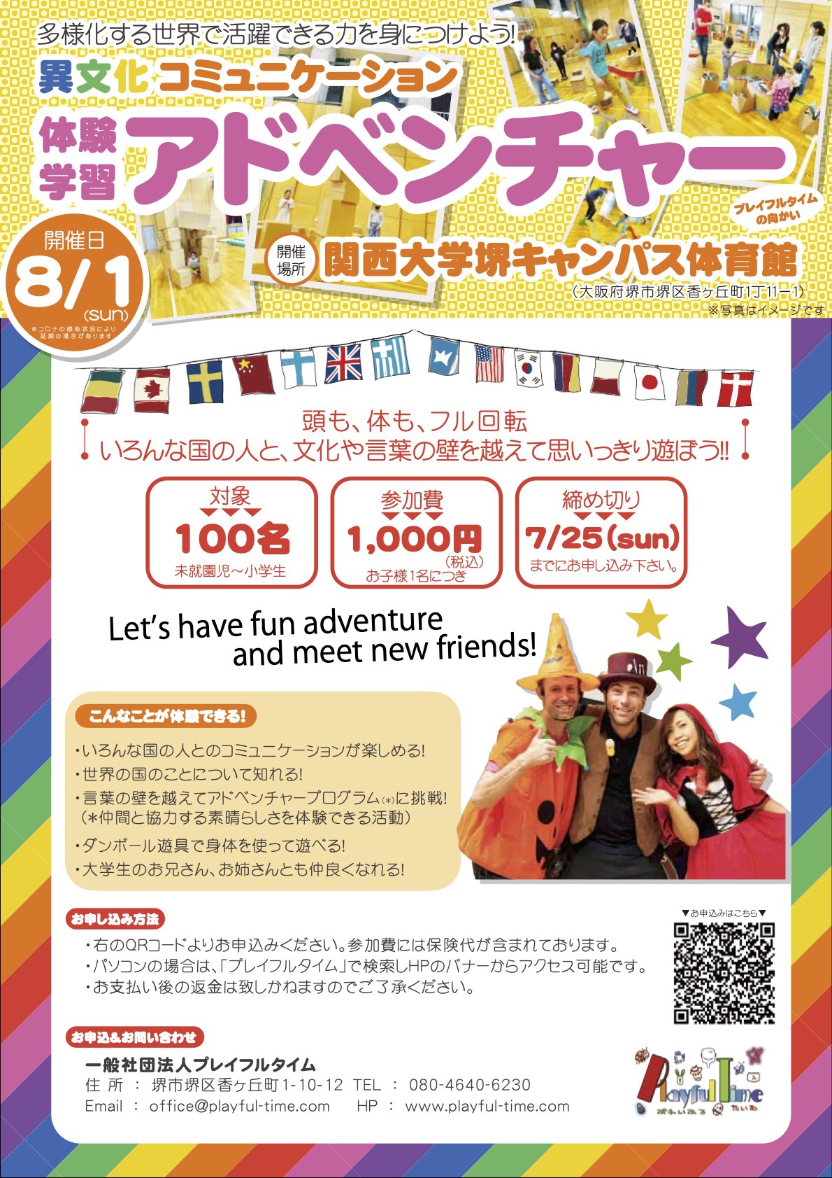 毎年夏にプレイフルタイムで「Playful Festival」のイベントを開催していますが、今年はその代わりに 関西大学堺キャンパスの体育館で夏のイベントを開催します。