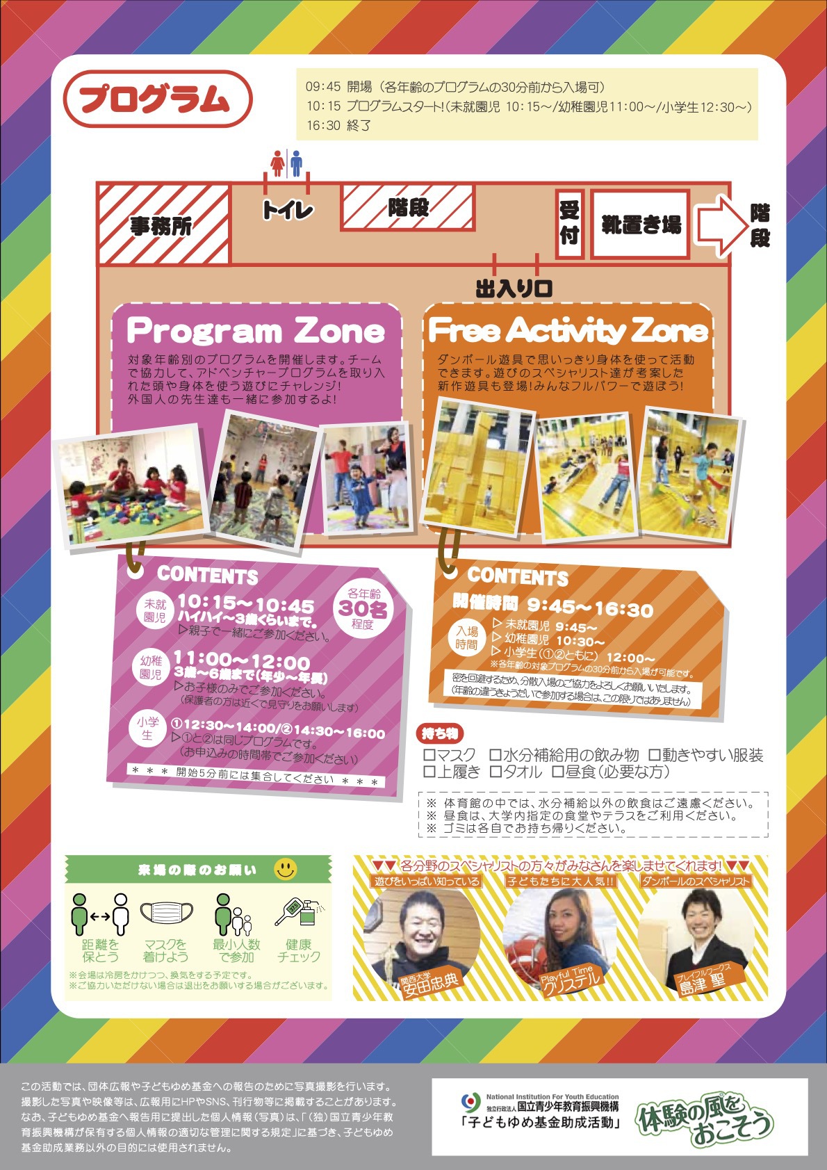 対象年齢別のプログラムを開催する「 Program Zone」と、ダンボール遊具で自由に遊べる「 Free Activity Zone」がありますので、未就園児さん〜小学生までのお子様が楽しめます♪