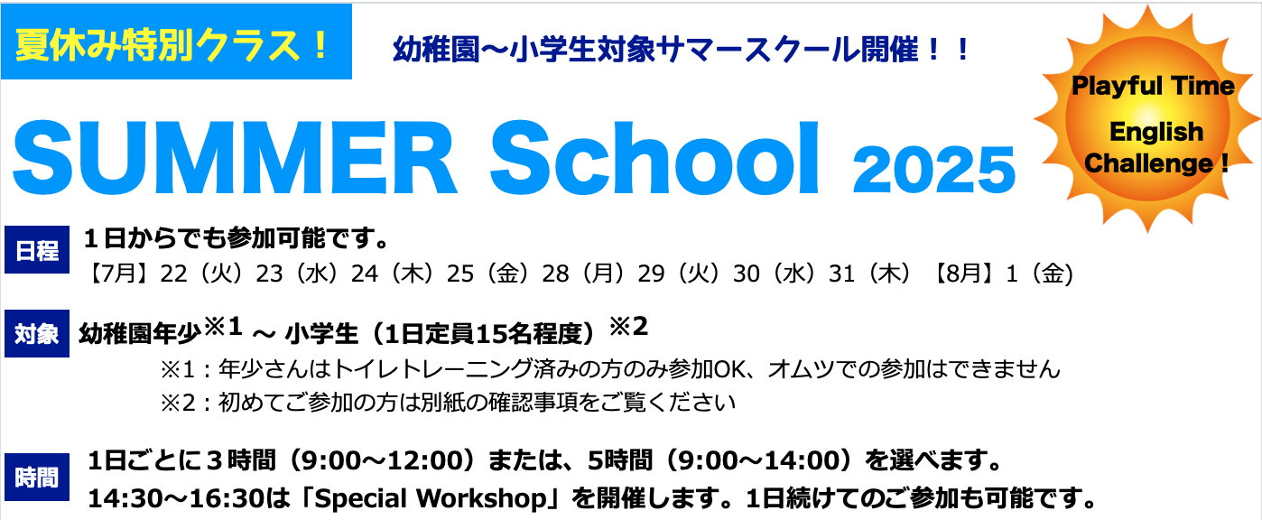 Playful Timeでは、夏休み期間中、幼稚園から小学校低学年を対象とした Summer English Schoolを開催します!