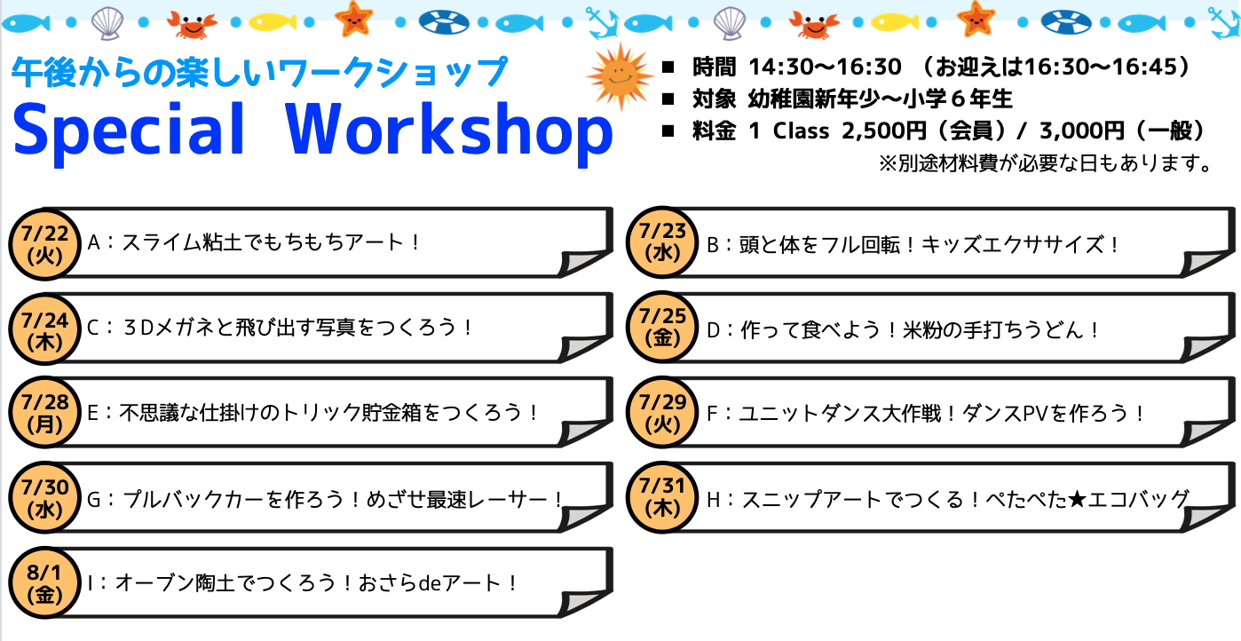 Special Workshop では、日替わりの楽しいワークショップをご用意しています。