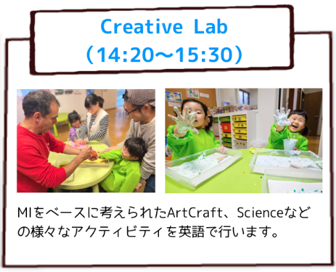 テーマに合わせた歌やゲームで英語を楽しむ「English Circle Time」と週替わりで様々なアクティビティを行う「Creative Lab」